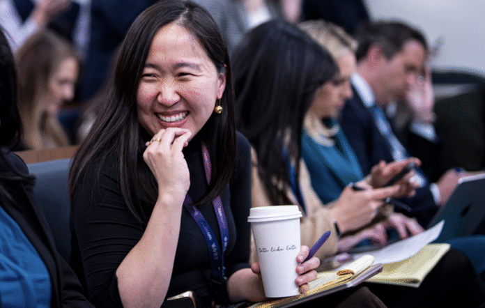 Seung Min Kim, an Associated Press White House reporter and CNN political analyst, pointed to the ceremony as a preview of the president’s broader messaging strategy. However, her phrasing immediately drew attention.