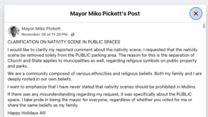 This isn’t about decorations anymore. It’s about drawing the line — and in Mullins, that line happens to be right under a manger.